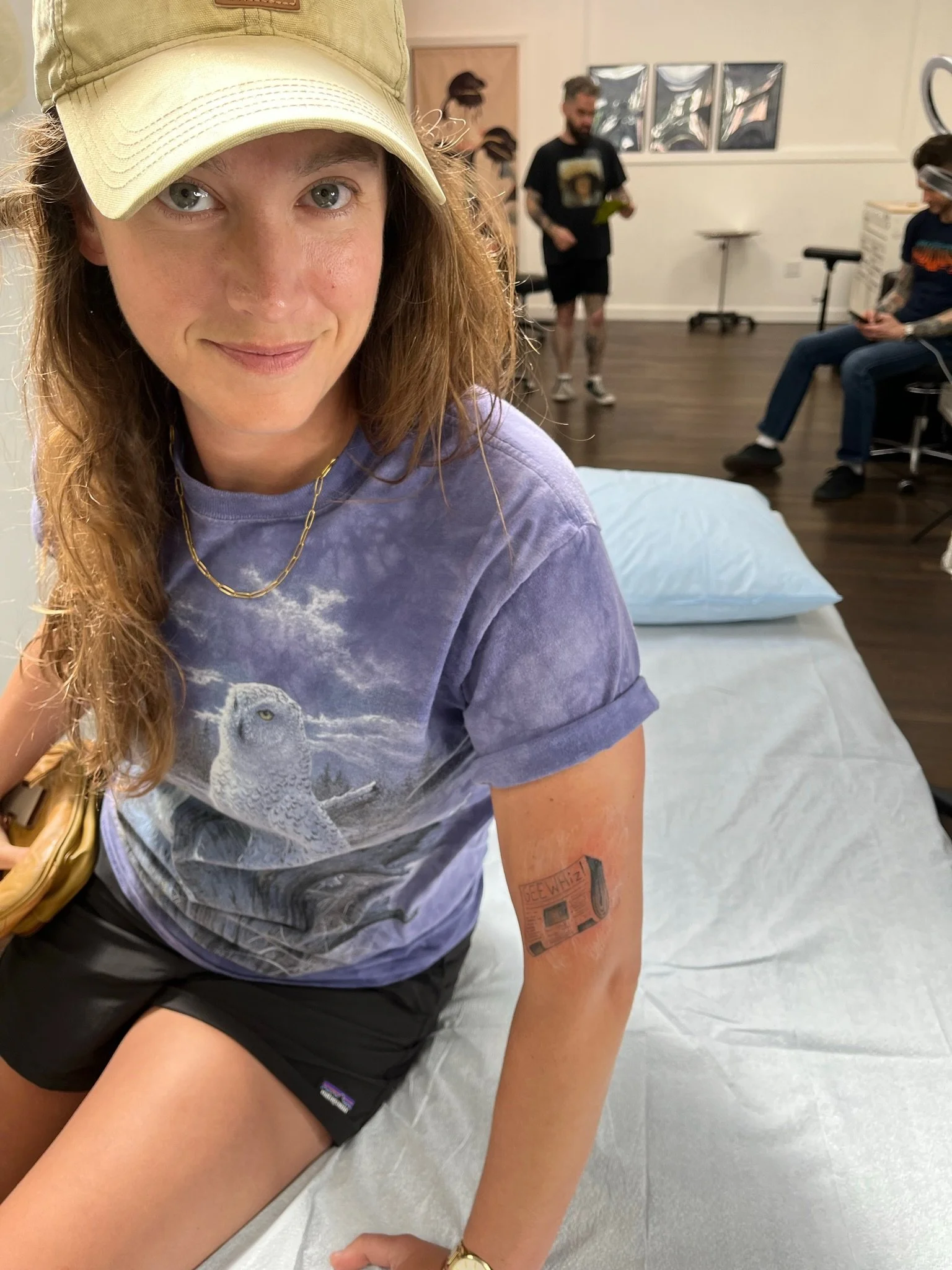 We first connected in the fall of 2024 by way of a dating app. Marie messaged Krisanne with emphatic agreement on Krisanne’s dating prompt stance of needing to find a front-facing toilet paper woman to complete her. We were taken by one another’s kind eyes, beauty, and the immense joy that poured out of each others’ photos on the dating platform. We were each drawn to notable shots of Marie sitting in a life-sized, neon lit tinned fish can, beaming with laughter while surrounded by her community, and Krisanne showing off the fresh ink of her Gee Whiz tattoo whilst sporting a t-shirt adorned with barn owls.